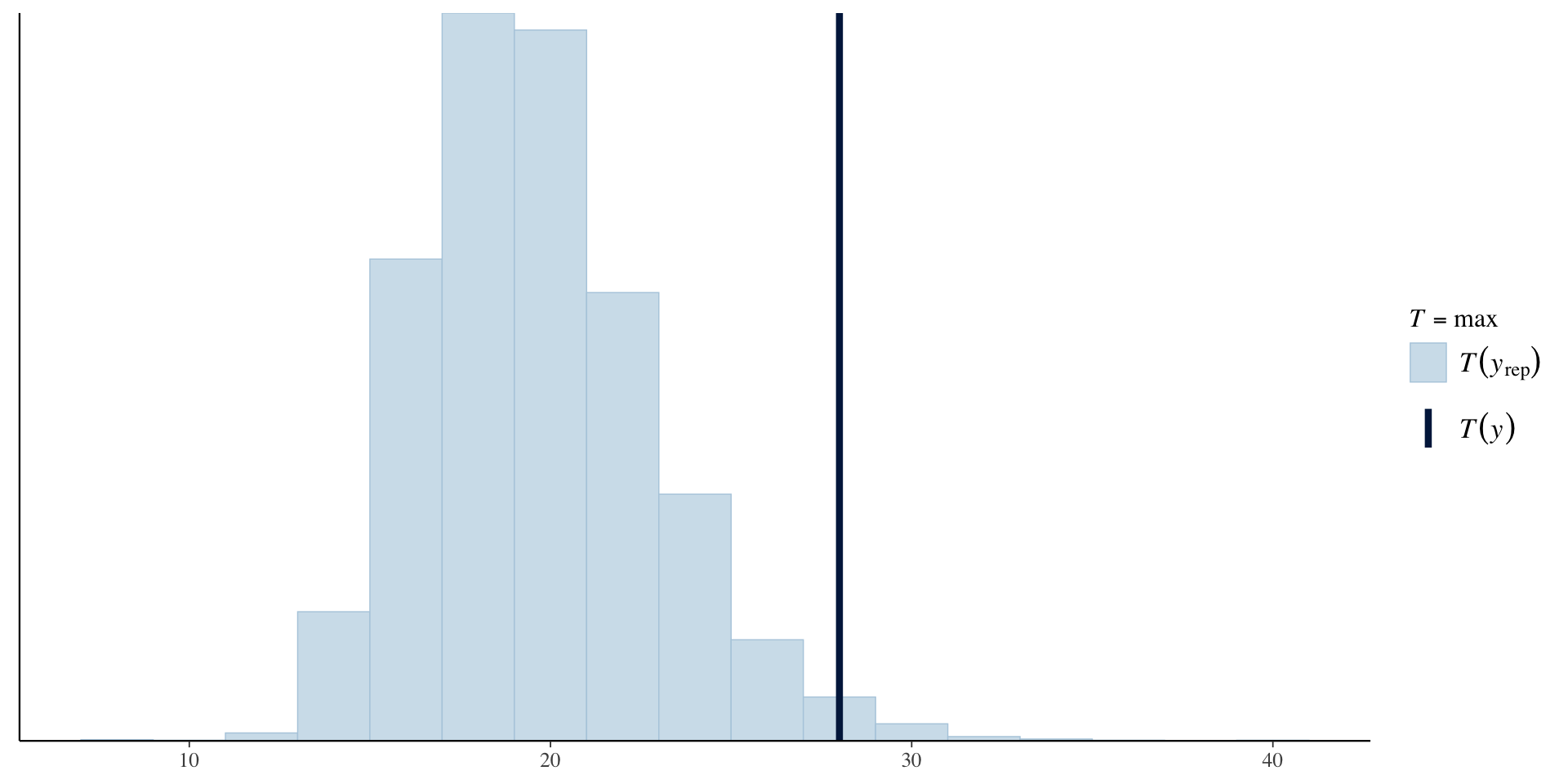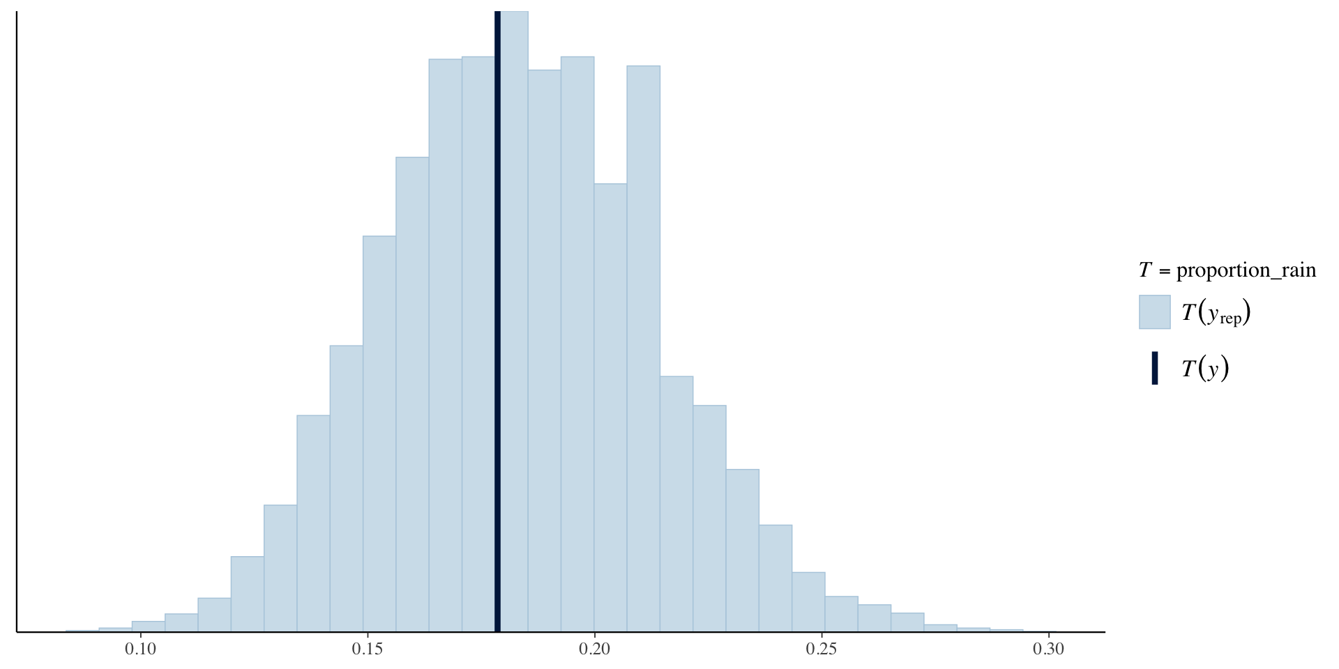 Check observed proportion of days on which it rained vs proportion of days on which it rained in each of the posterior simulated datasets.