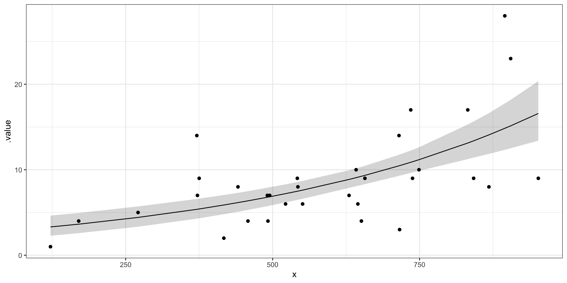 \end{eqnarray*}\] So \(e^{\alpha}\) = the expected count at \(x = 0\).