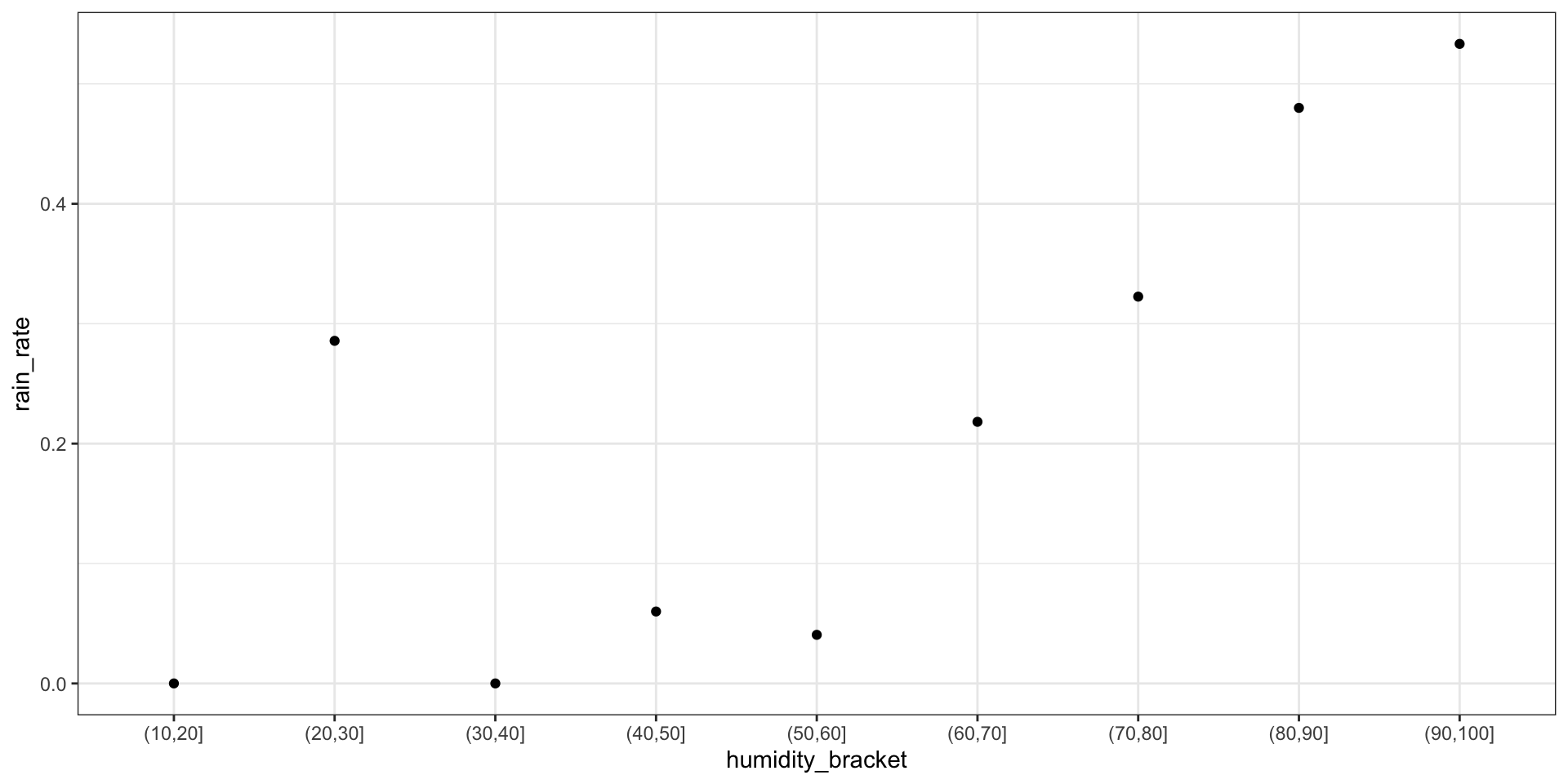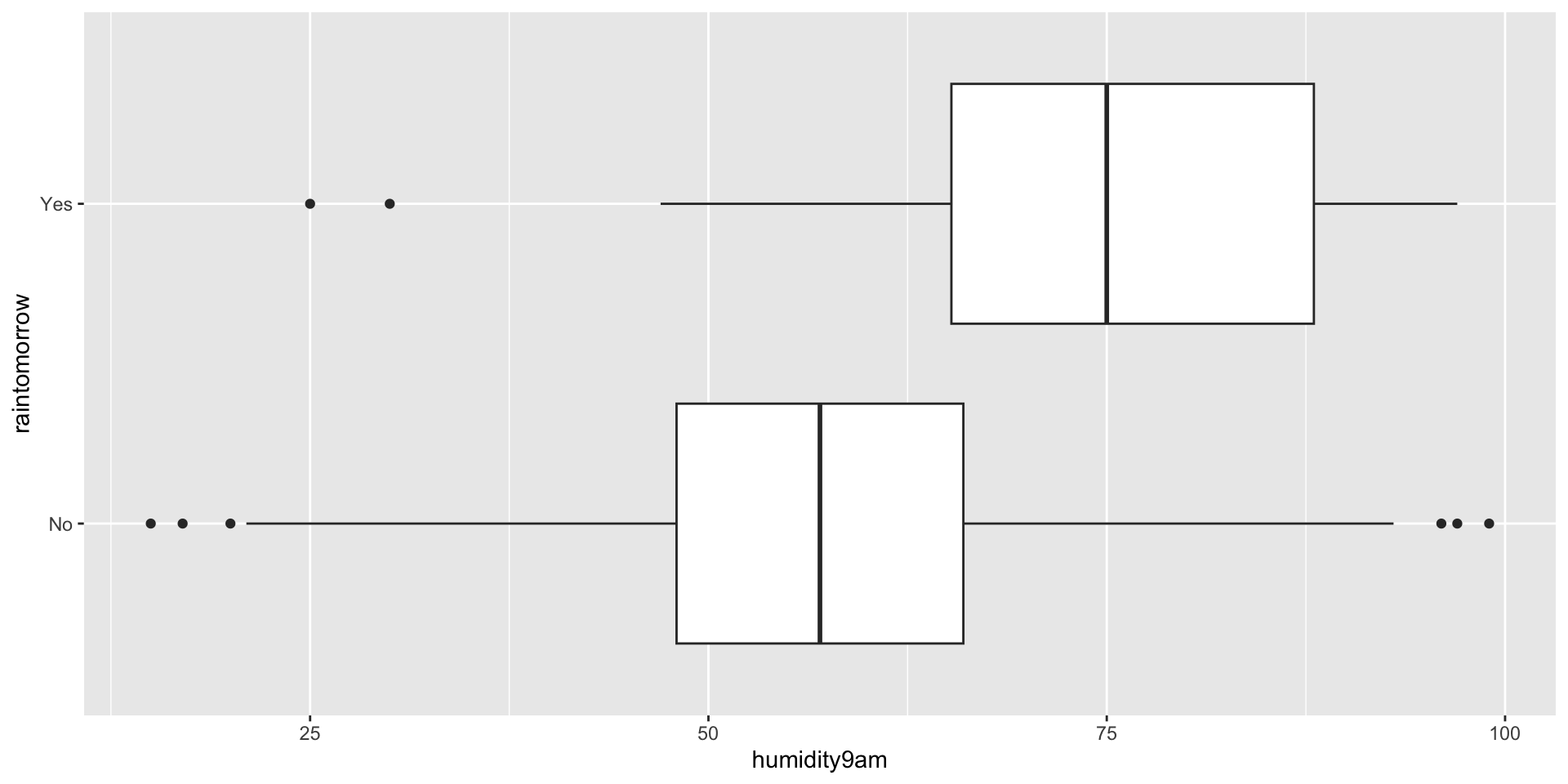 Suppose we find ourselves in Australia, the city of Perth specifically. Located on the southwest coast, Perth experiences dry summers and wet winters. Our goal will be to predict whether or not it will rain tomorrow. We’re going to use today’s humidity as a predictor. Here’s a quick look at the data.