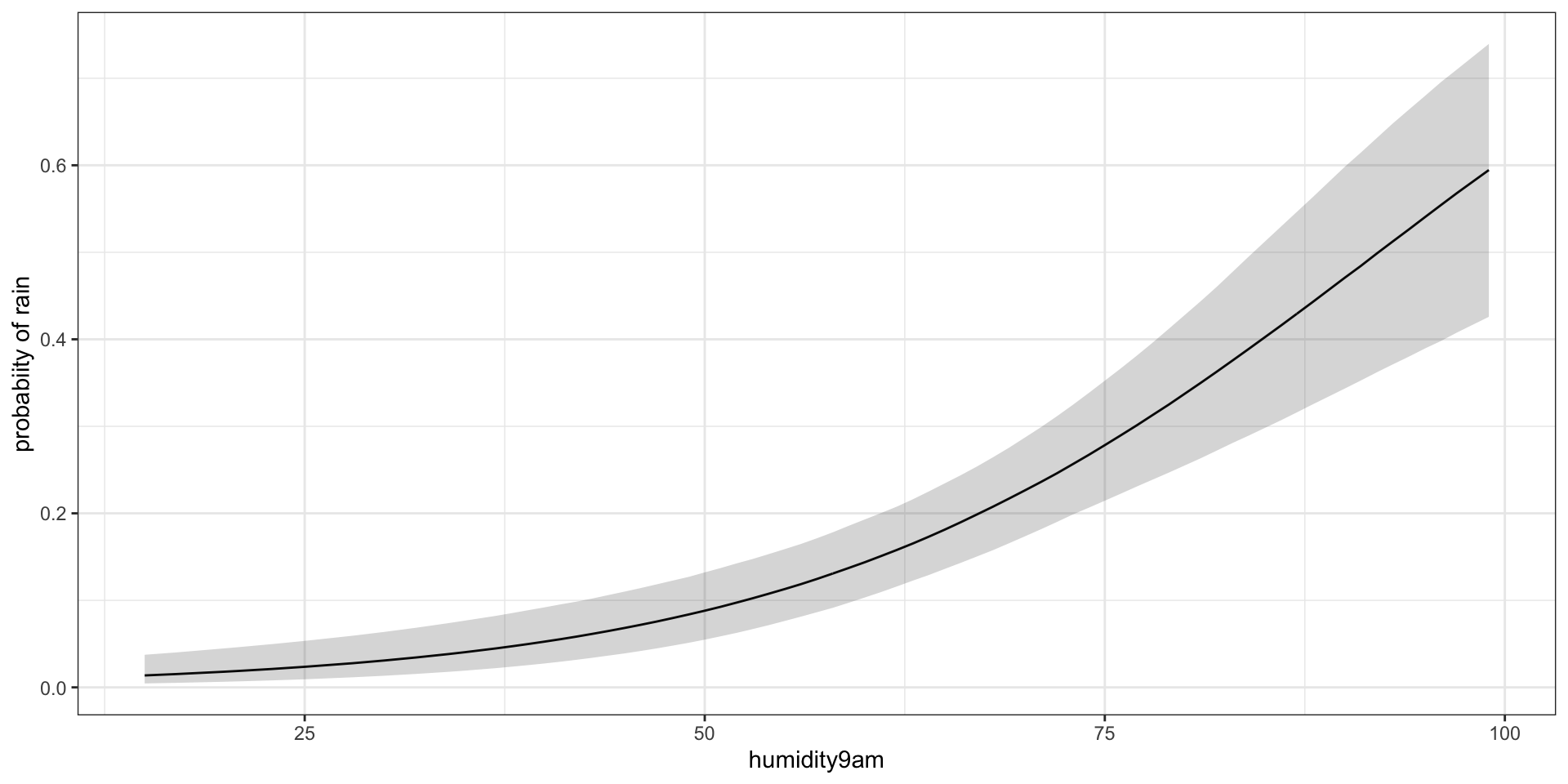 pred_summary <- m %>%gather_rvars(pi.i[pred_ind]) %>%median_qi(.value) %>%mutate(x = jags.data$x.i)ggplot(pred_summary,aes(x = x, y = .value),alpha =0.3) +geom_line() +geom_ribbon(data = pred_summary,aes(ymin = .lower, ymax = .upper), alpha =0.2) +theme_bw() +xlab("humidity9am") +ylab("probabiity of rain")