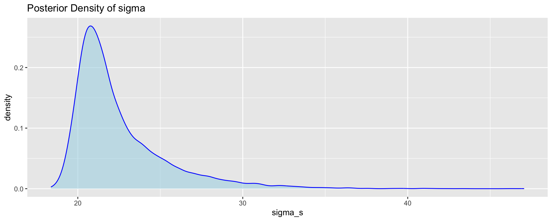 p6 <-ggplot(post_samps, aes(x = sigma_s)) +geom_density(fill ="lightblue", color ="blue", alpha =0.6) +ggtitle("Posterior Density of sigma") # Mean and credible interval for sigmasigma_mean <-mean(sigma_s)sigma_ci <-quantile(sigma_s, probs =c(0.025, 0.975))p6;cat("Mean of Sigma:", sigma_mean, "\n");cat("95% Credible Interval for Sigma:", sigma_ci, "\n")