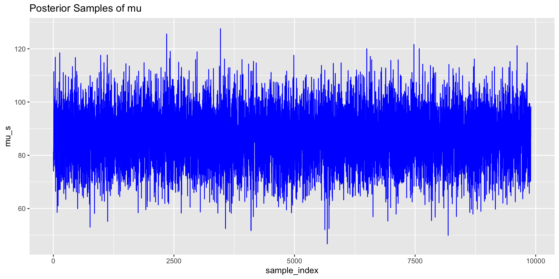 library(ggplot2)# Trace plot for mup1 <-ggplot(post_samps, aes(x = sample_index, mu_s)) +geom_line(colour ="blue") +ggtitle("Posterior Samples of mu")# Trace plot for sigmap2 <-ggplot(post_samps, aes(x = sample_index, sigma_s)) +geom_line(colour ="blue") +ggtitle("Posterior Samples of sigma")p1;p2