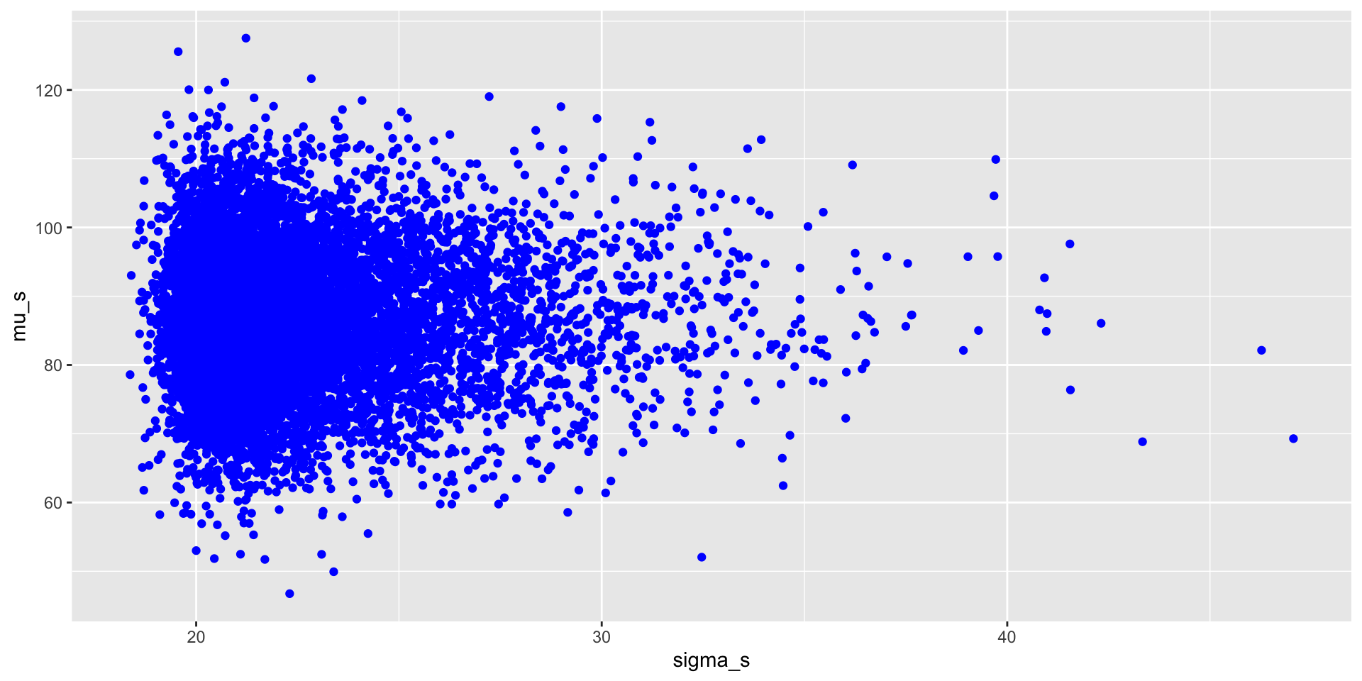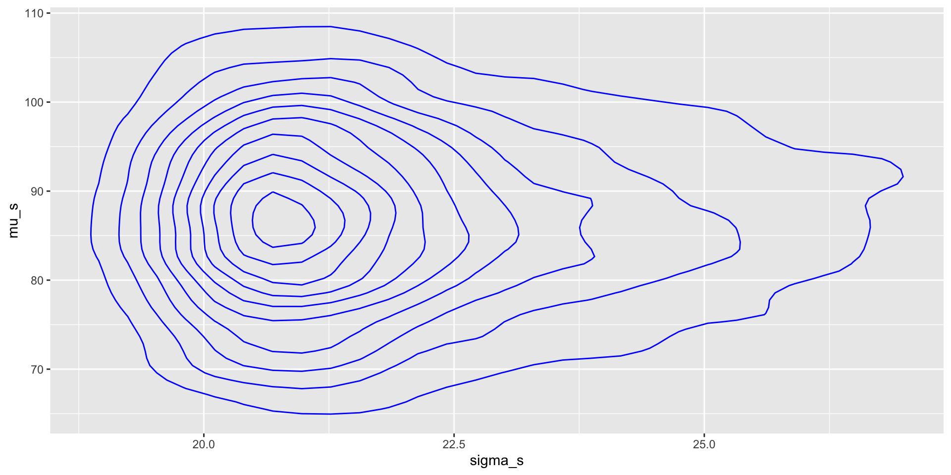 # Scatter plot of mu_s vs. sd_sp3 <-ggplot(post_samps, aes(x = sigma_s, mu_s)) +geom_point(colour ="blue") # Contour plot of joint densityp4 <-ggplot(post_samps, aes(x = sigma_s, y = mu_s)) +geom_density_2d(colour ="blue") p3;p4