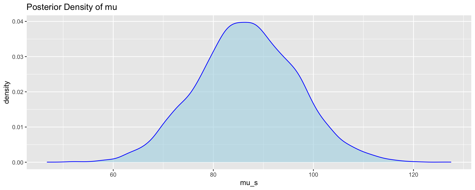# Density plot for posterior samples of mup5 <-ggplot(post_samps, aes(x = mu_s)) +geom_density(fill ="lightblue", color ="blue", alpha =0.6) +ggtitle("Posterior Density of mu") # Mean and credible interval for mumu_mean <-mean(mu_s)mu_ci <-quantile(mu_s, probs =c(0.025, 0.975))p5;cat("Mean of Mu:", mu_mean, "\n");cat("95% Credible Interval for Mu:", mu_ci, "\n")
